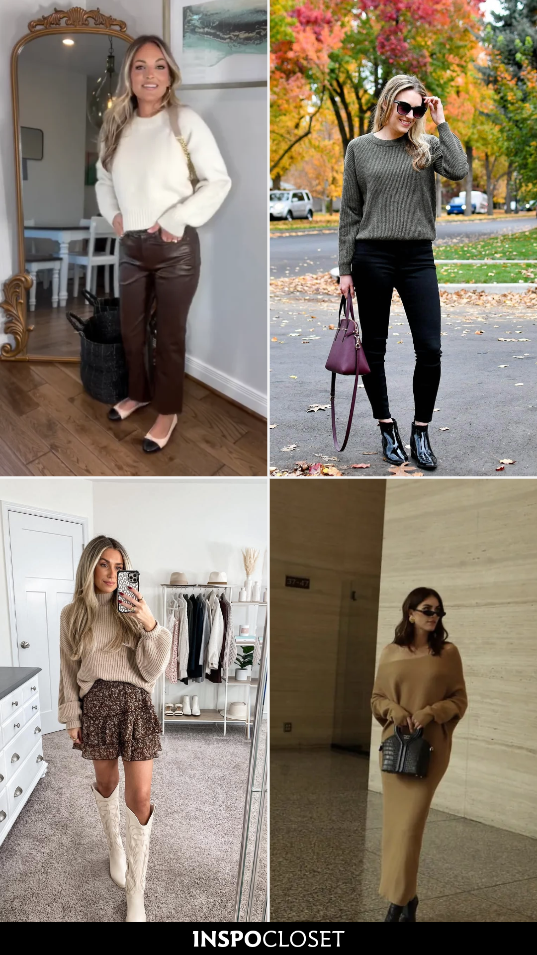 There’s something timeless about cream and brown together — clean, cozy, and completely foolproof. This outfit nails it: a chunky ivory sweater paired with chocolate leather pants. It’s equal parts comfort and polish — like the fashion version of pumpkin pie and espresso.