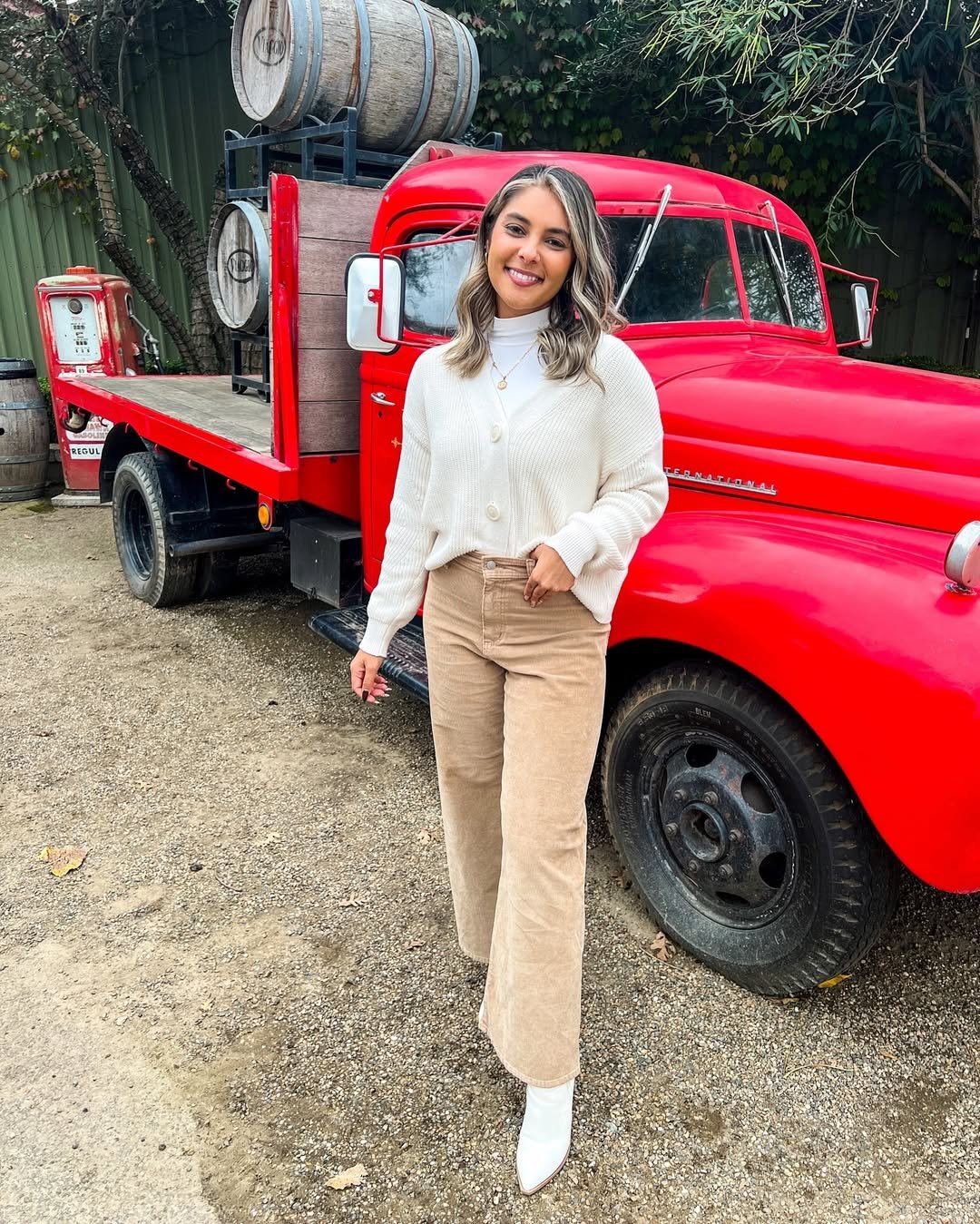 If Thanksgiving comfort had a dress code, this would be it. The creamy cardigan paired with wide-leg corduroy pants and white boots makes for a soft, cozy statement that still looks chic.