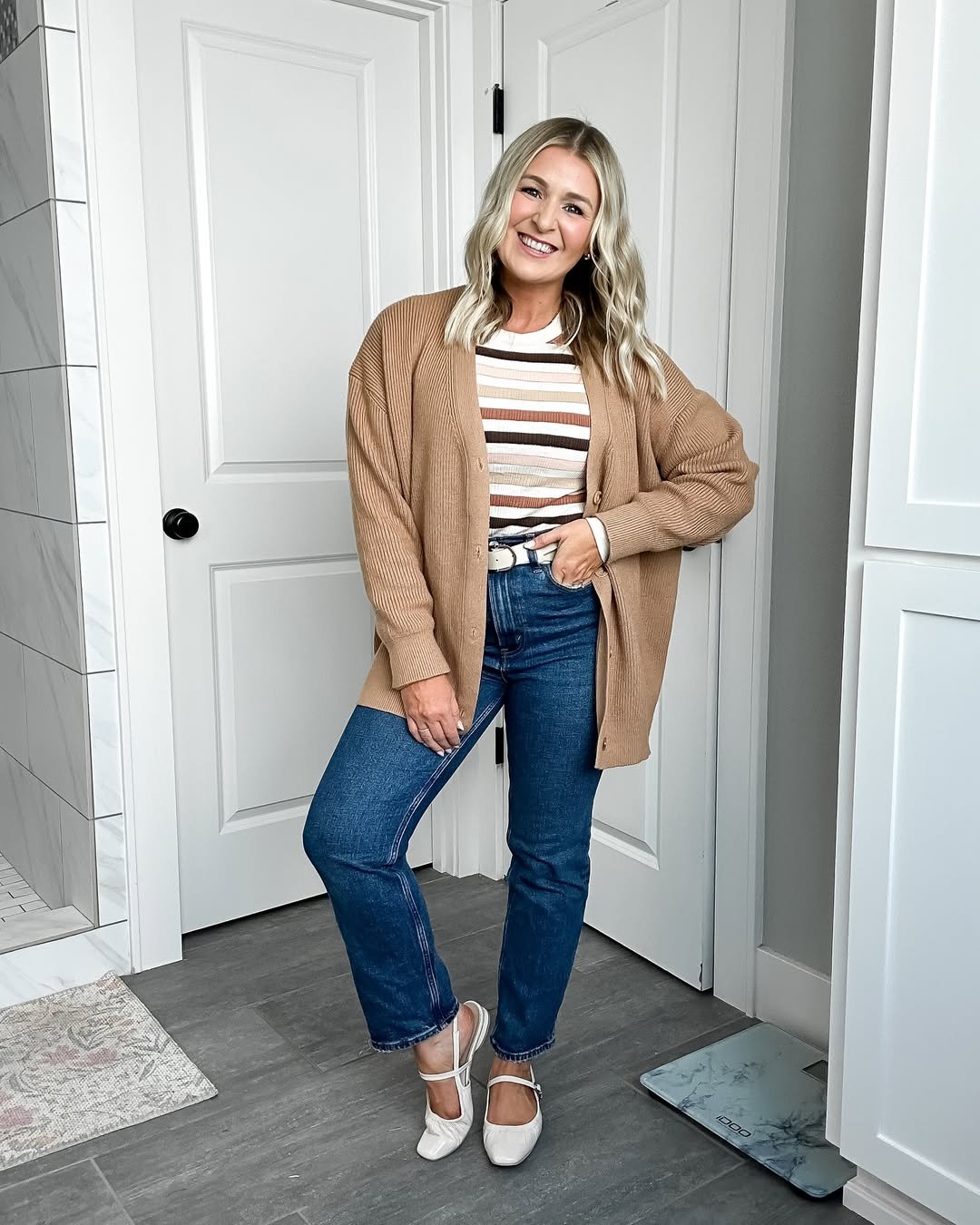 This outfit is proof that casual can still be cute. The striped top adds a little retro playfulness under that camel cardigan, and the medium-wash denim grounds the whole look in cozy fall simplicity.