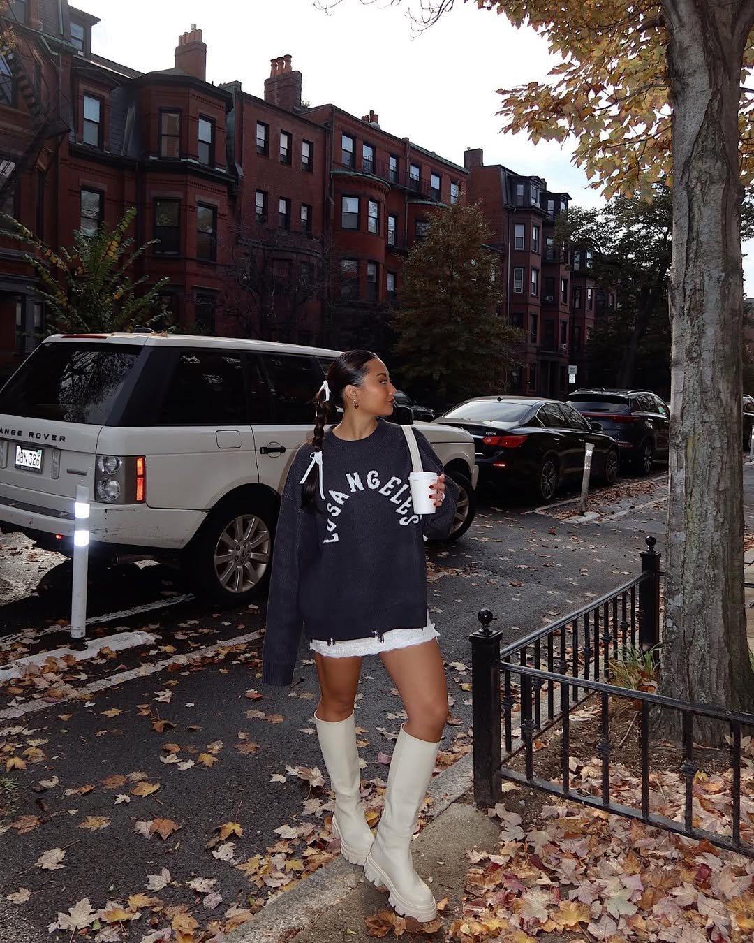 Nothing says Thanksgiving-in-the-city like an oversized sweatshirt and tall boots moment. The dark “Los Angeles” crewneck gives sporty ease, while the creamy knee-high boots and matching hair bow add that soft, feminine touch. It’s cozy without trying, like the perfect mix of loungewear and city edge.