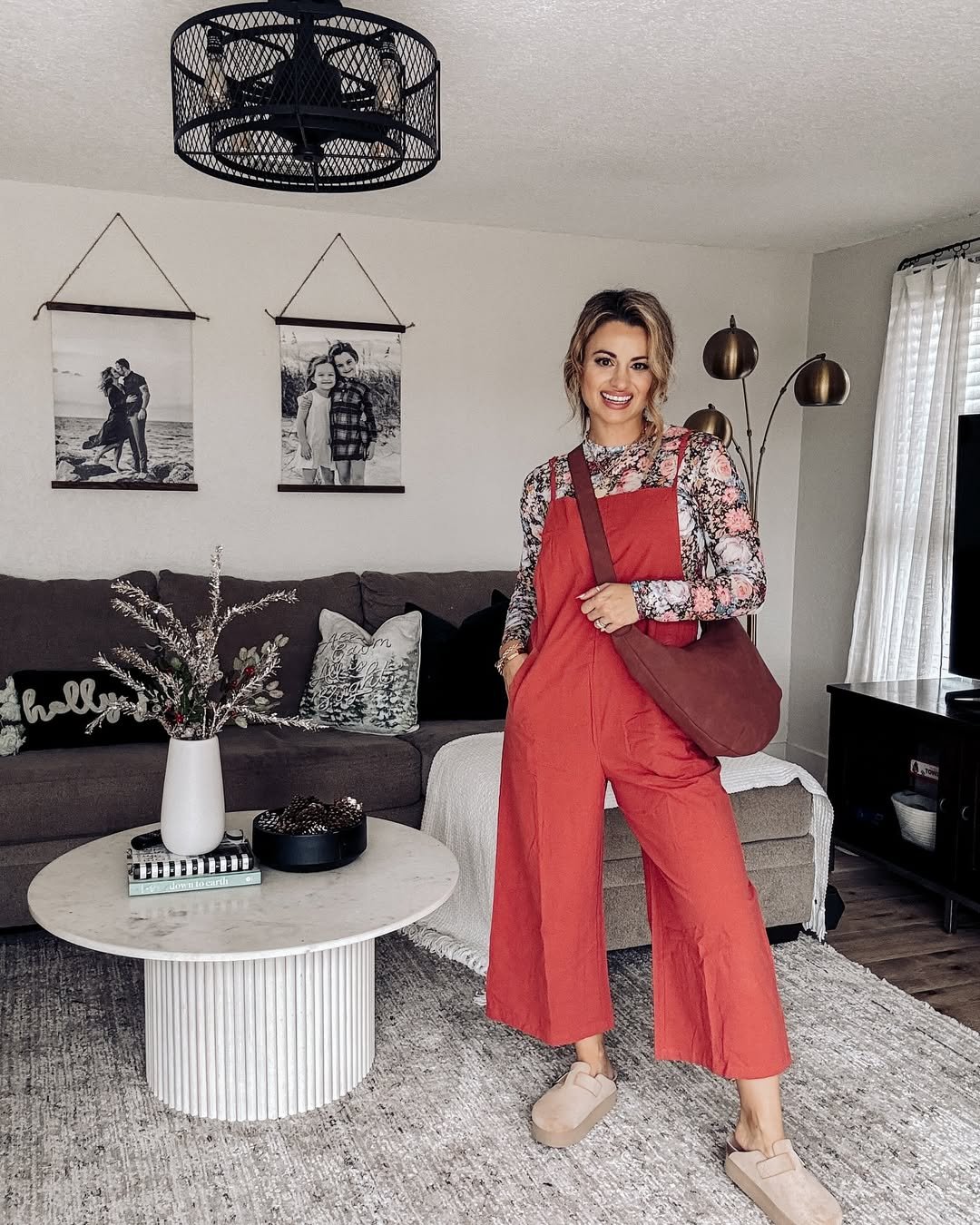 This look feels like a warm hug. The cranberry overalls add a playful twist to the usual fall palette, while the floral long-sleeve underneath keeps it fun and feminine. It’s the perfect mix of cozy and cute — ideal for hosting a family get-together or baking pies in style.