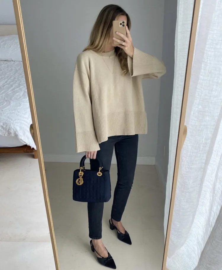 There’s something beautifully understated about a neutral oversized sweater with black skinny jeans. It’s that clean, simple combo that always works. The pointed flats and structured navy bag bring just enough polish to make it holiday-ready.
