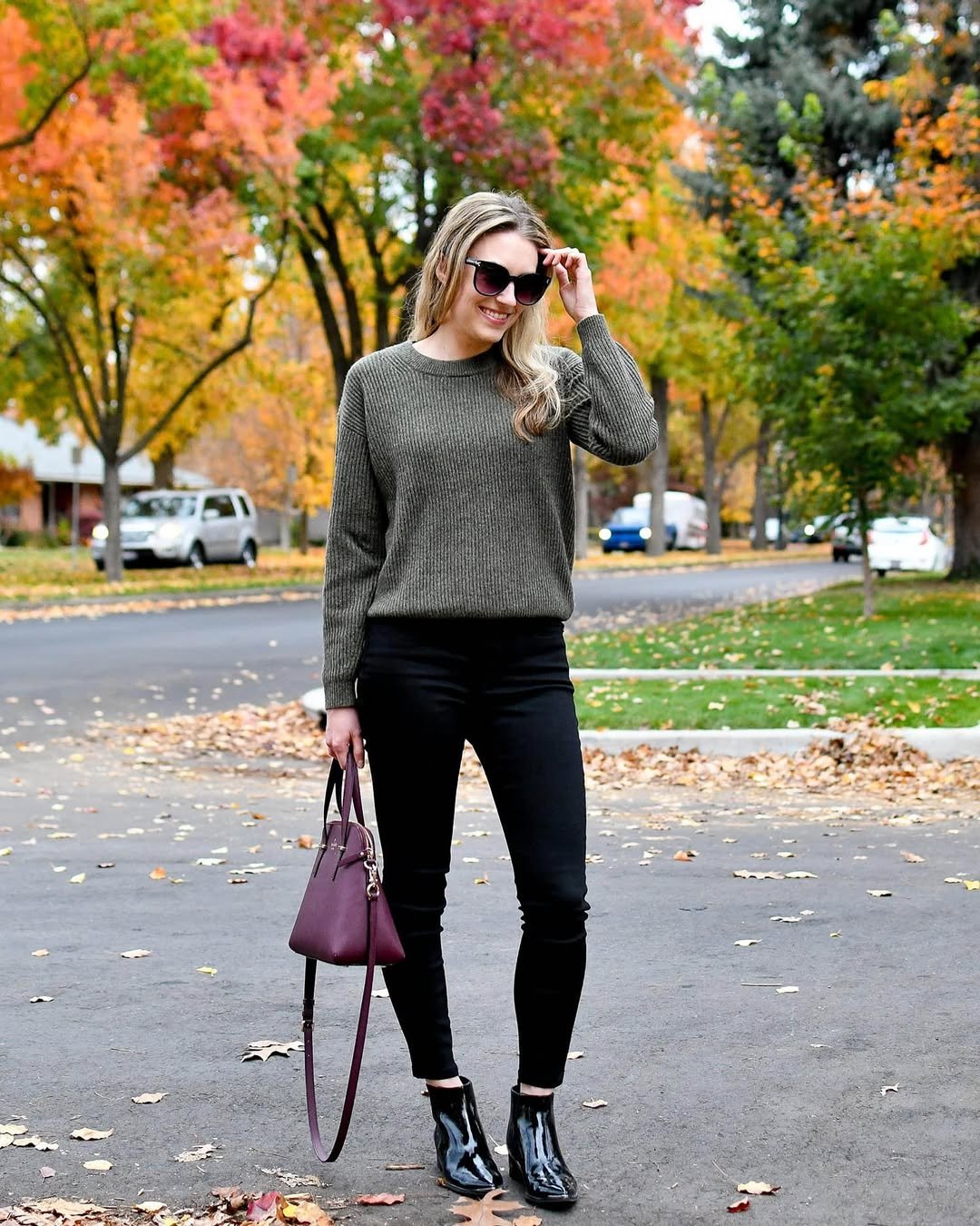 Sometimes, the best Thanksgiving looks are the simplest. An olive-green sweater, black skinnies, and sleek ankle boots — classic, flattering, and always right. Add a plum bag for a hint of festive color, and you’ve got understated perfection.