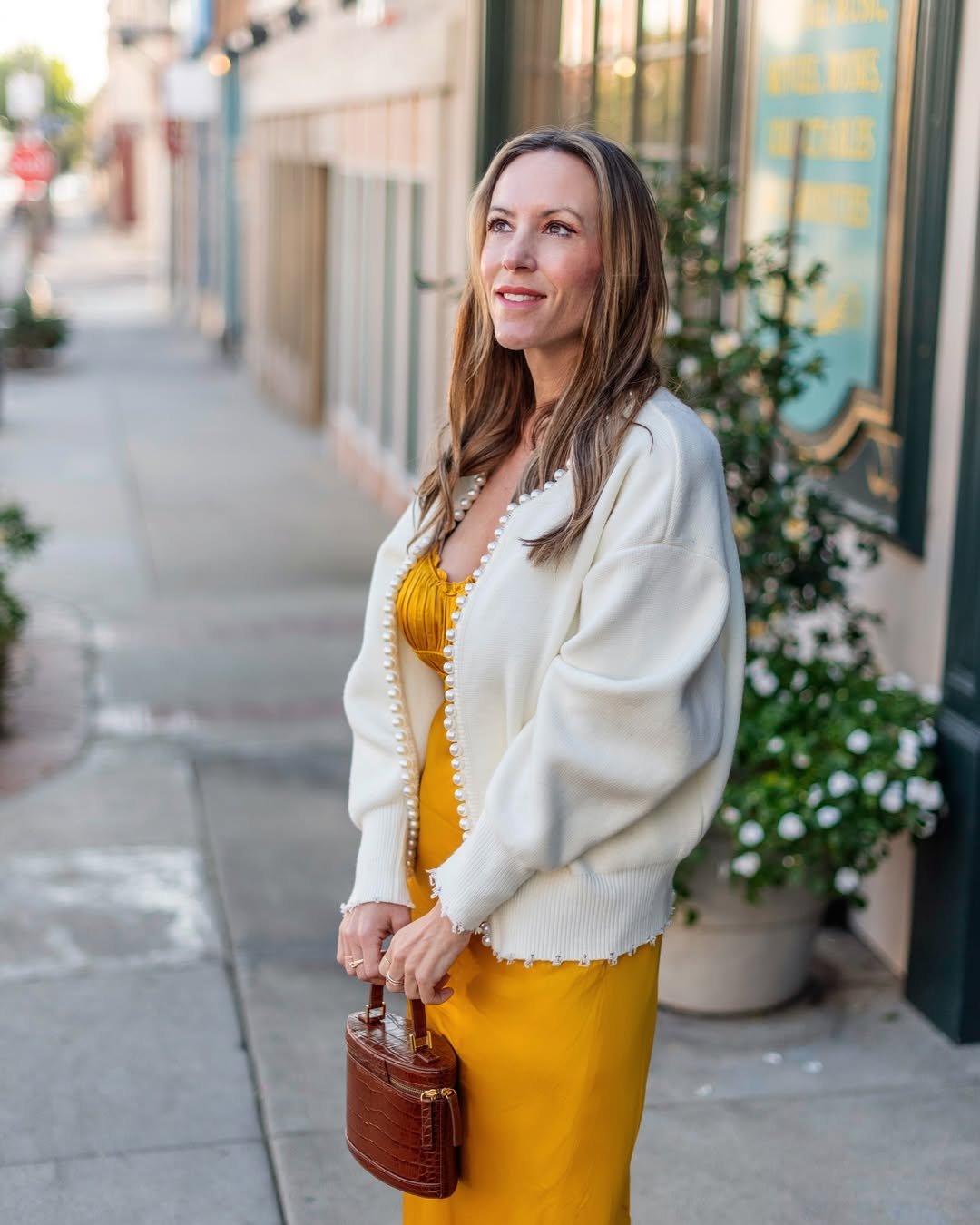 Warm, golden tones for Thanksgiving? Always a yes. This rich mustard dress paired with a pearl-trimmed cream cardigan feels festive, feminine, and completely timeless. The structured brown bag adds a luxe touch that elevates the whole outfit.