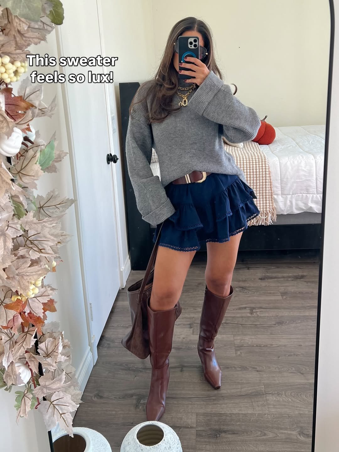 This one’s all about texture — the ribbed gray sweater, the tiered navy mini, and those rich brown knee-high boots. It’s a Thanksgiving look that feels a little elevated but still fun and wearable.