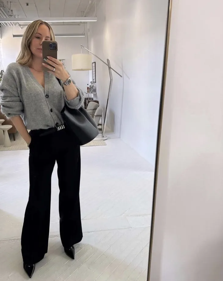 Polished, pared-back, and quietly powerful — this look is a love letter to simplicity. The grey cardigan tucked into black wide-leg trousers is so effortlessly refined, proving you don’t need bold colors to make a statement.