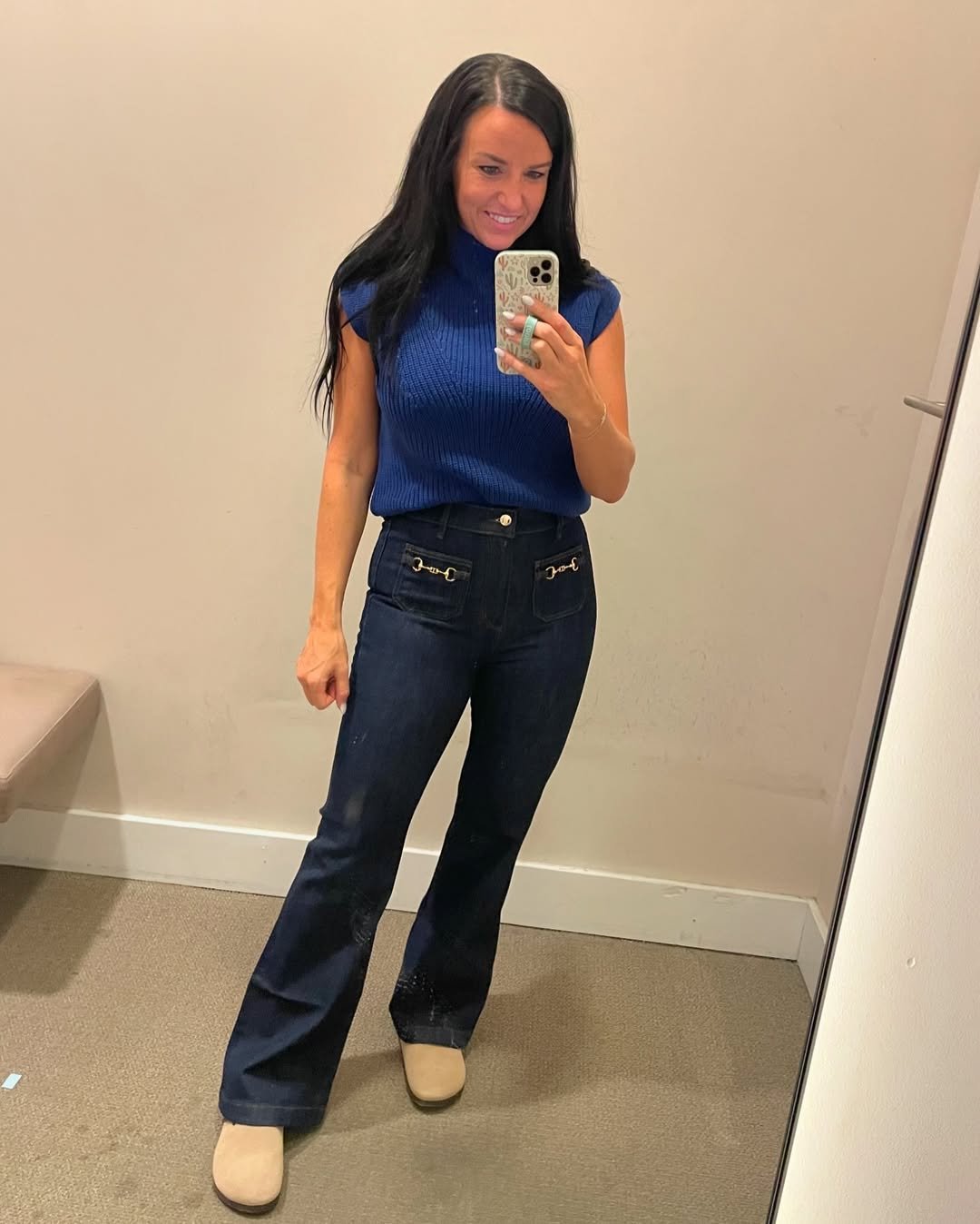 Sometimes, simplicity is the strongest statement. This navy sleeveless knit and dark denim combo is clean, sharp, and beautifully tailored. The gold hardware on the jeans adds just the right touch of polish.