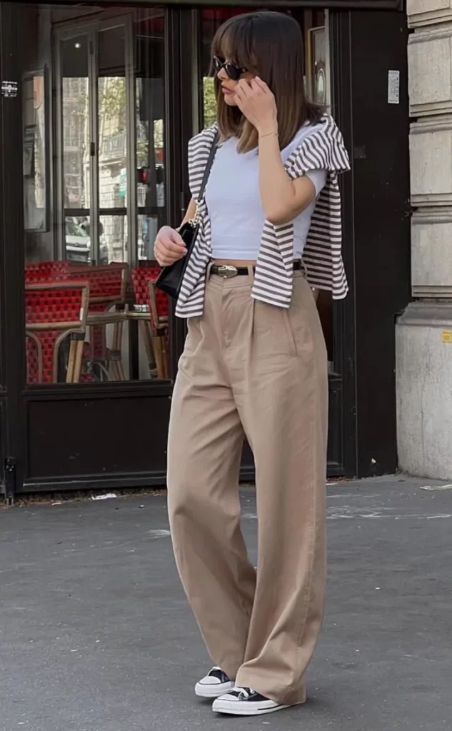 Neutral and nonchalant — this outfit has that quiet French-girl flair written all over it. The beige wide-leg pants paired with a crisp white tee and striped pullover draped just-so? Effortless perfection.