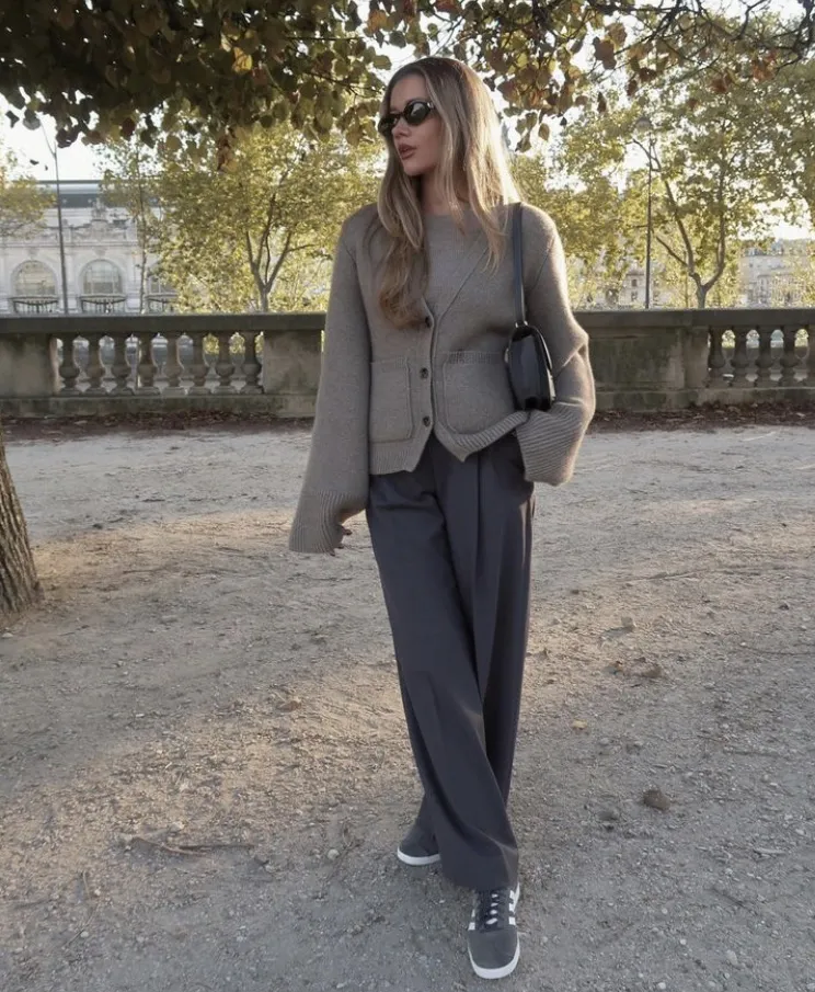 This look channels all the European fall energy — slouchy gray trousers, a perfectly fitted cardigan, and retro sneakers for that effortless balance between chic and casual. It’s the kind of outfit that whispers confidence instead of shouting it.