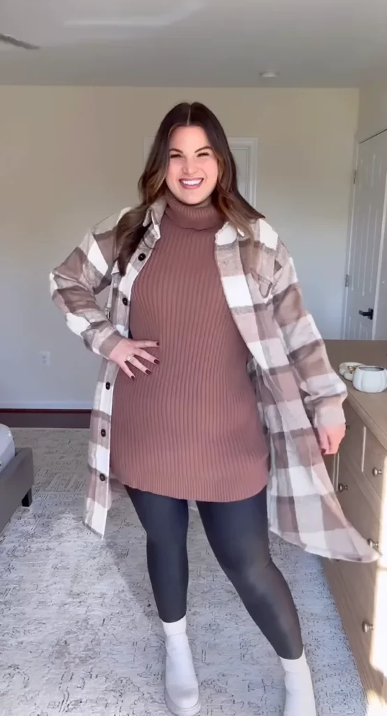 Here’s the coziest outfit formula for Thanksgiving: an oversized plaid shacket, a ribbed knit dress, and the comfiest pair of leggings. It’s that blend of cabin-core and casual-chic that makes you look festive and feel comfy enough for seconds (and dessert).