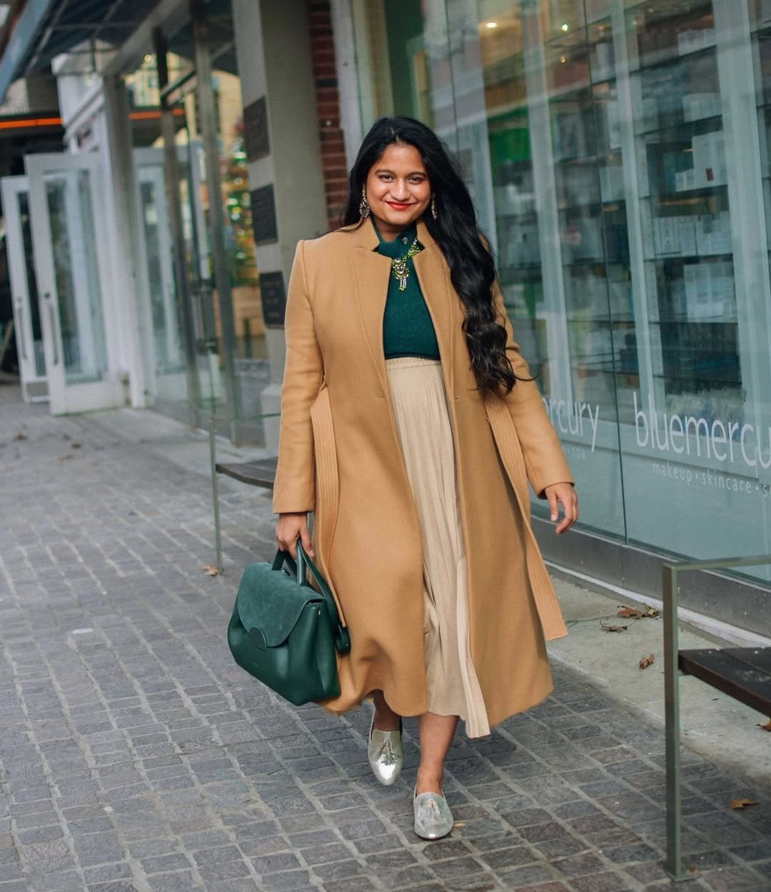 If sophistication were a color palette, it would look exactly like this. The rich camel coat layered over a forest green sweater and cream skirt creates such a striking balance—soft, elegant, and quietly festive.
