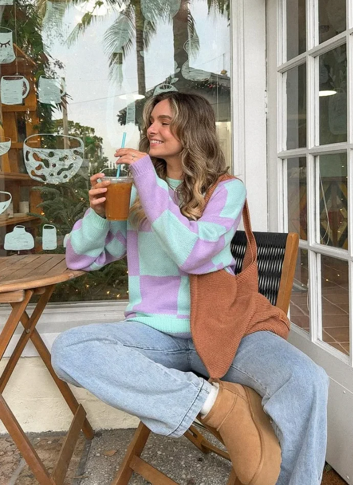 Who says Thanksgiving outfits have to stick to oranges and browns? This pastel checkered sweater adds a fun twist with mint and lilac tones — cheerful, cozy, and totally refreshing. Paired with relaxed jeans and tan boots, it gives off that easy coffee-date vibe.