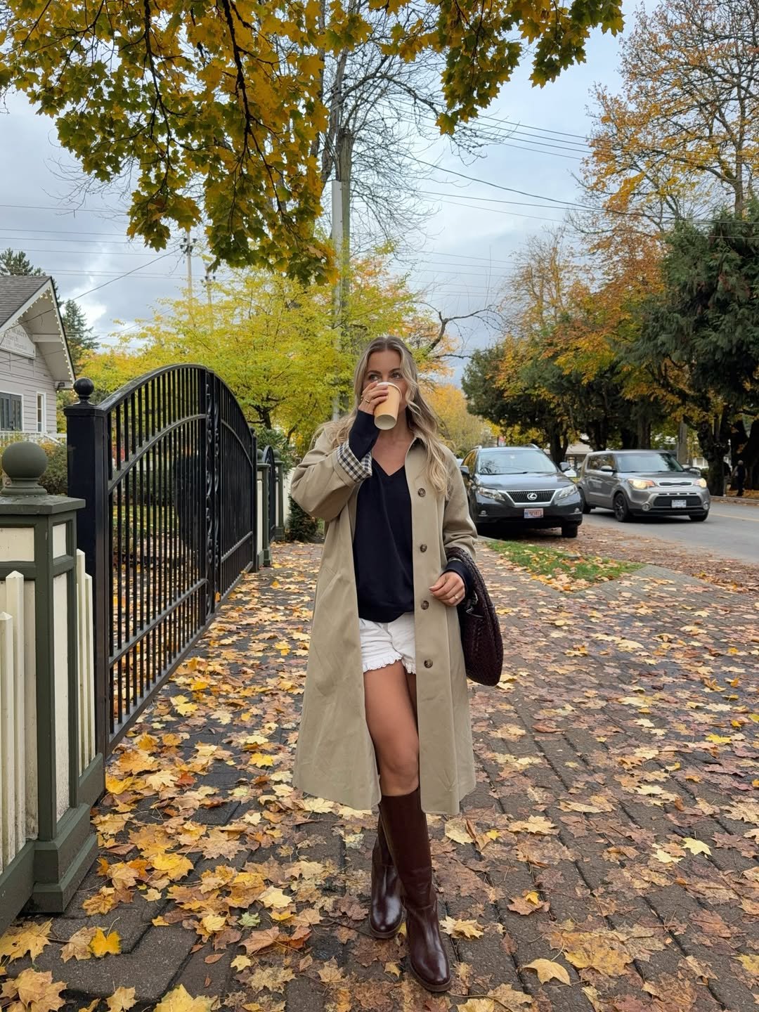 What makes this outfit stand out is how effortless it feels. A simple dark top and shorts underneath keep things relaxed while the trench and boots add structure. It’s the perfect outfit for those crisp mornings when coffee tastes just a little better.