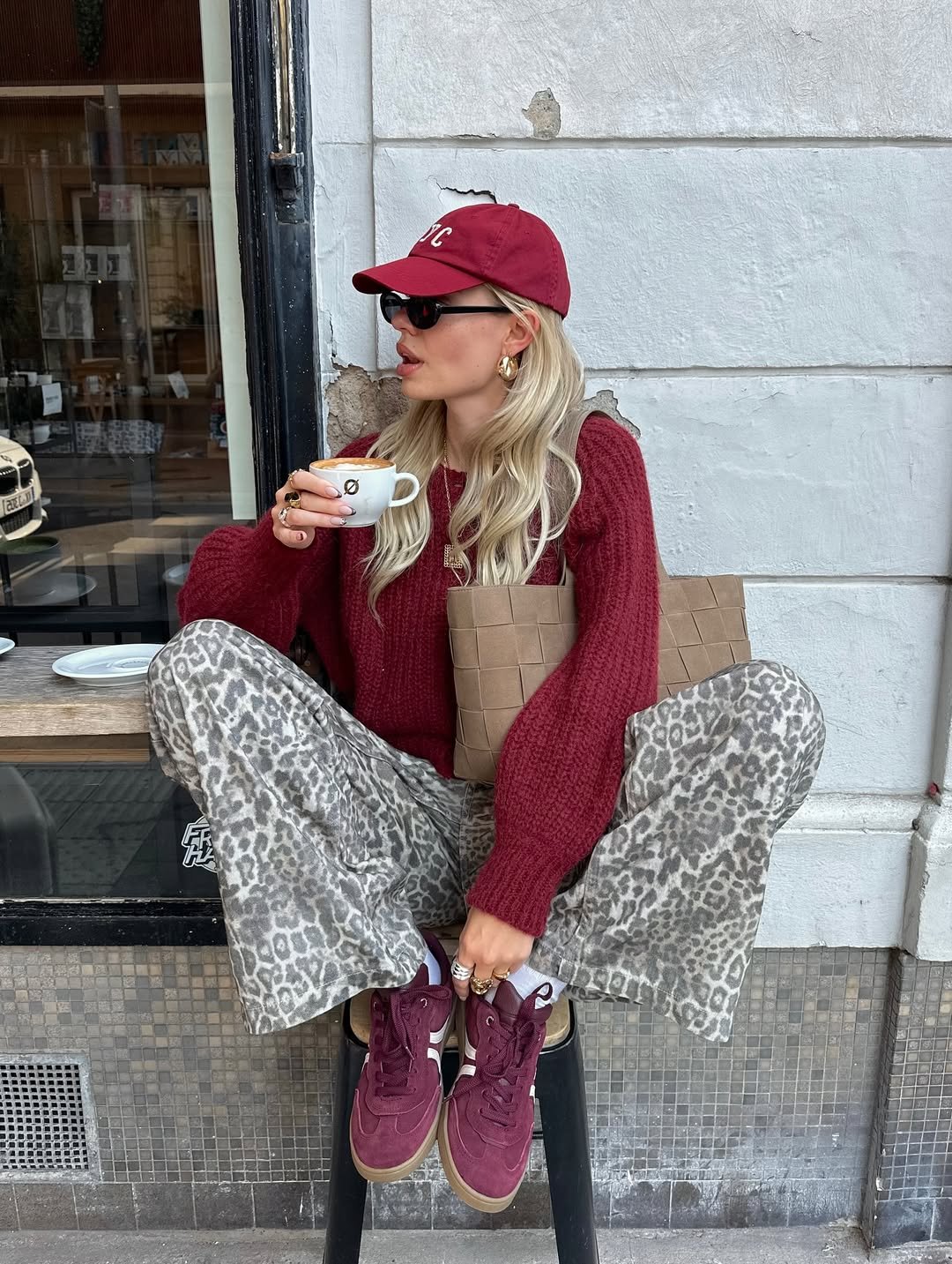 A burgundy sweater and matching sneakers instantly warm up this coffee date outfit. The rich color paired with leopard print trousers creates a look that feels bold but still wearable.