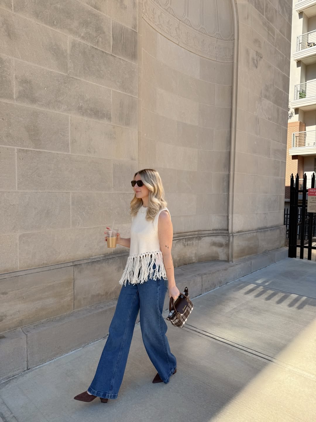 Some coffee dates call for something easy and unfussy, and this outfit nails that feeling. A textured fringe knit paired with relaxed wide-leg denim creates a laid-back silhouette that still looks intentional. Add pointed boots and a structured mini bag, and the outfit suddenly feels more styled than simple.