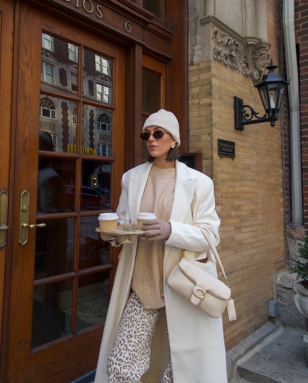 I love how the leopard print pants sneak in a playful edge without disrupting the calm palette. It’s polished but relaxed, the kind of outfit that works whether you’re grabbing cappuccinos to-go or lingering outside a cozy café door for a slow morning chat.