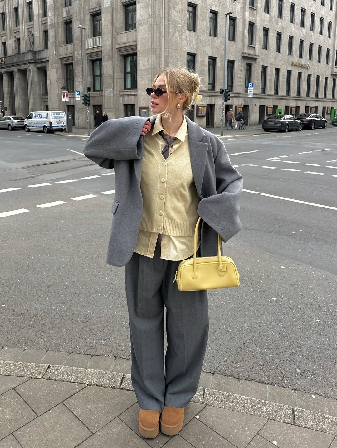 The soft yellow bag adds a subtle pop of color against the neutral layers. Walking through the city with coffee in hand, it gives off that effortless fashion-editor energy.
