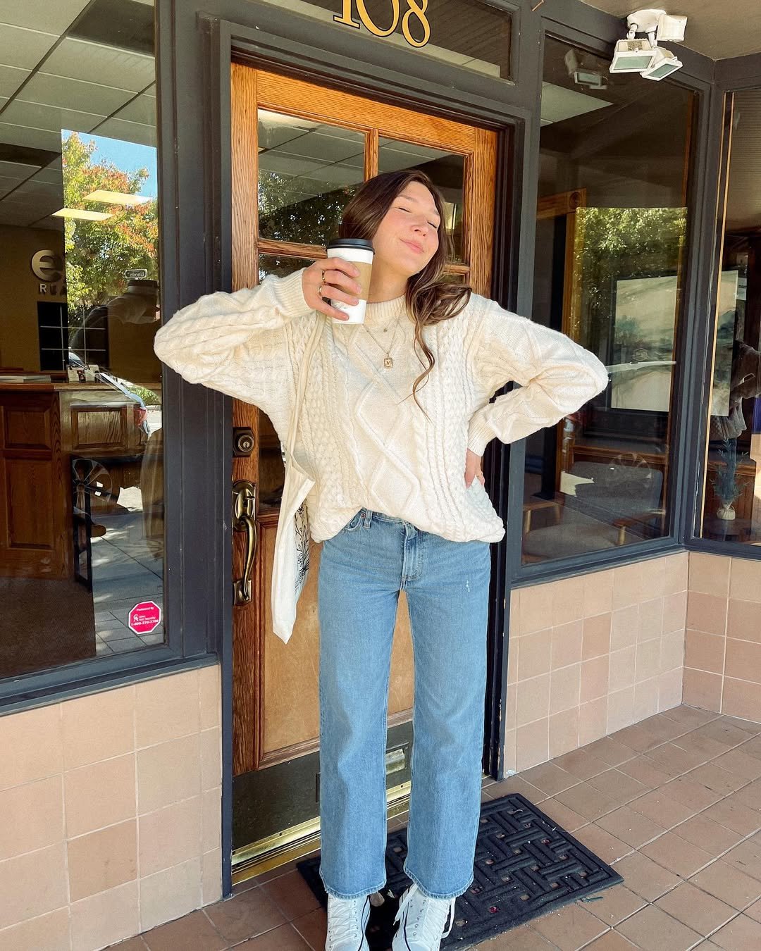 There’s something timeless about a cable knit sweater and straight-leg denim. It’s the kind of outfit that works every single time, especially when paired with white sneakers and a warm coffee in hand.