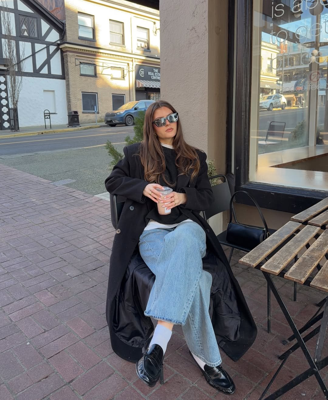 A long black coat and vintage-style loafers always bring that effortless city style. Paired with relaxed denim and dark sunglasses, this outfit feels cool without trying too hard.