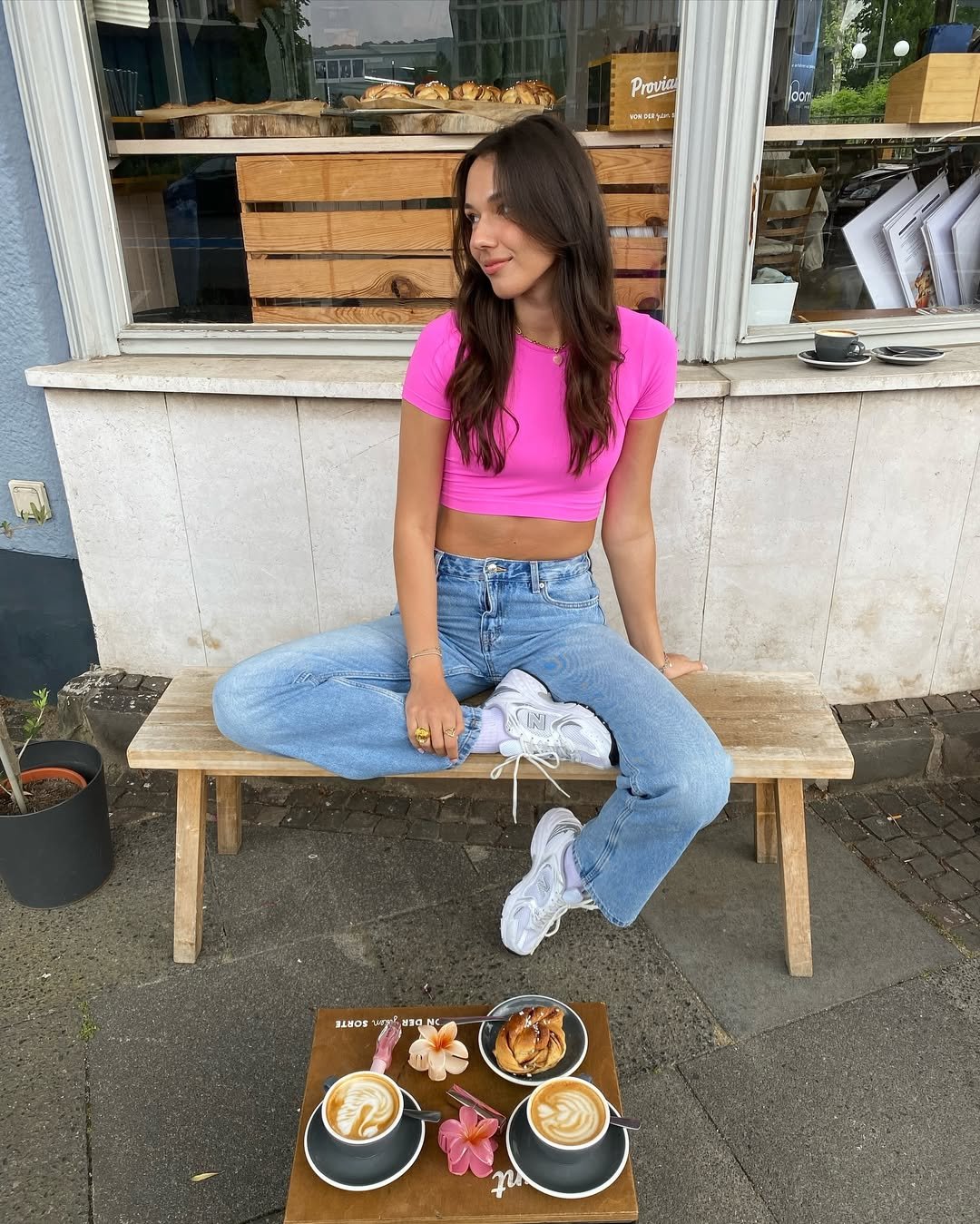 Sometimes all you need is one bold piece to make an outfit memorable. Here, the bright pink crop top instantly brings energy to a classic denim look, giving it that fun coffee-date vibe.