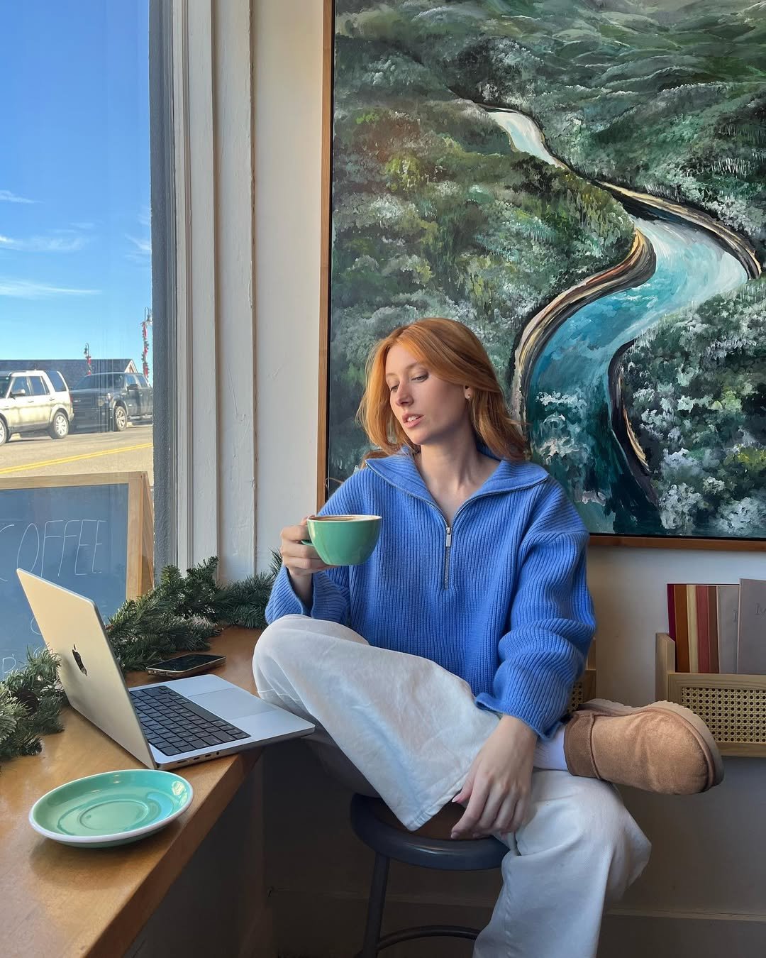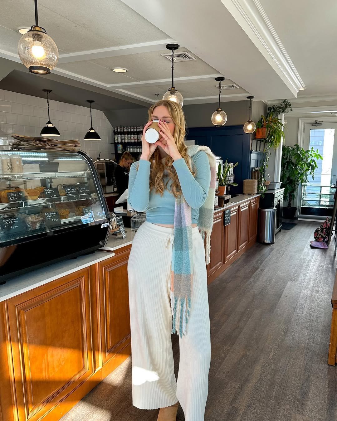 A bright knit and a warm drink by the window feels like the ultimate coffee shop aesthetic. The relaxed blue sweater paired with soft white pants creates a cozy palette that feels calm and creative.