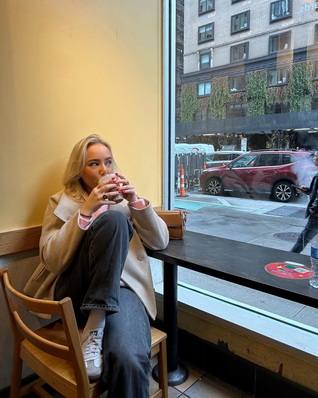 A neutral coat over a pink knit adds warmth and softness, while the classic sneakers keep everything grounded and easy. It’s the kind of outfit that makes you want to linger just a bit longer, watching the street and finishing that last sip of coffee.