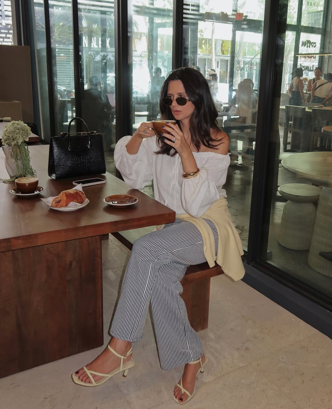 This look feels like a slow brunch turning into an afternoon coffee date. An airy off-shoulder blouse paired with striped trousers creates a relaxed silhouette that still feels refined.