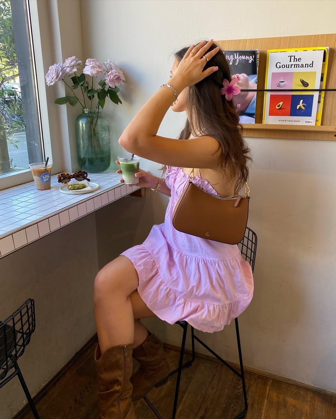 The little shoulder bag and flower tucked behind the ear add a sweet touch that fits perfectly with the pastel café setting. It’s the kind of look that makes a simple matcha break feel like a tiny summer escape.