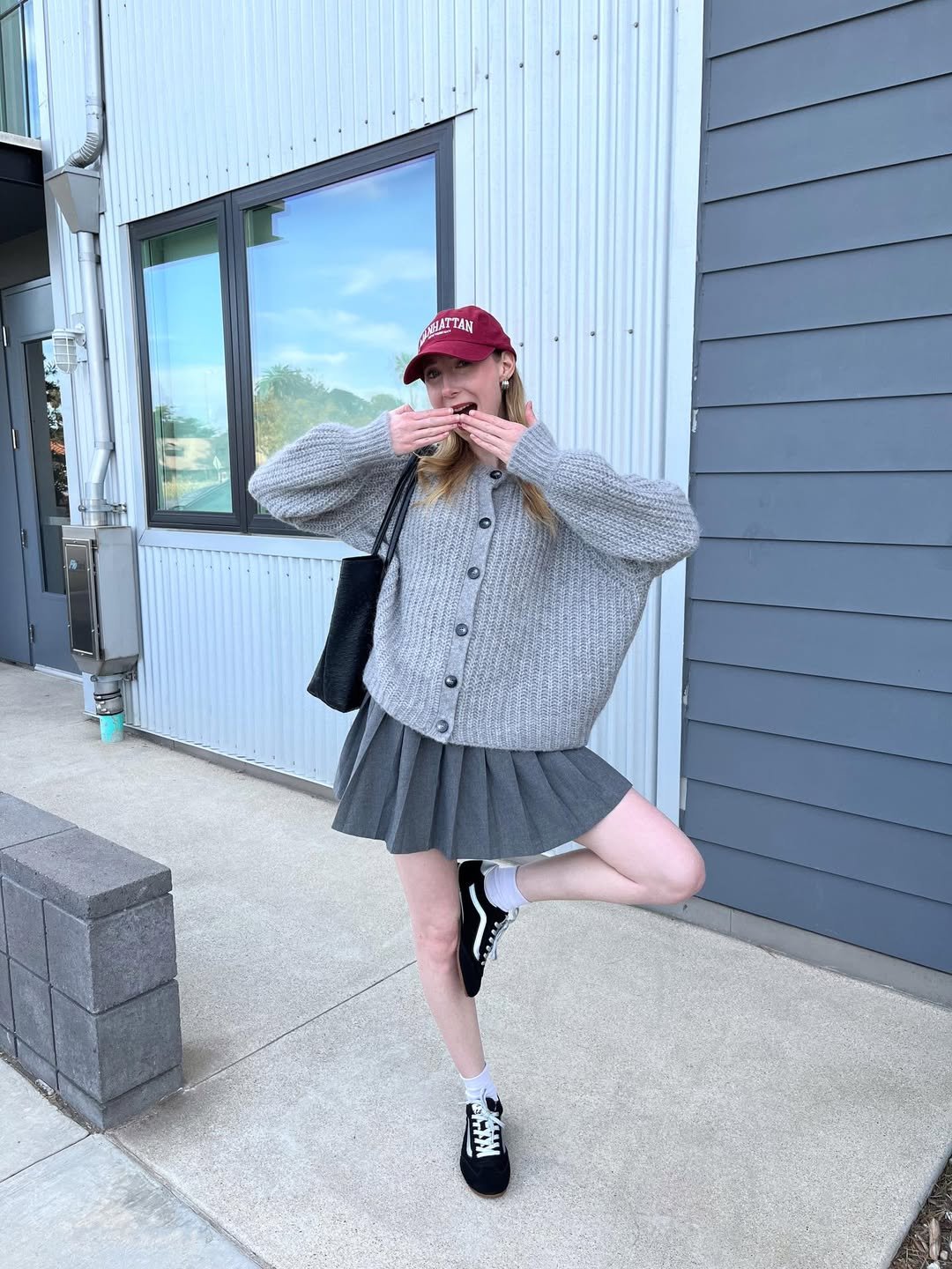 This look leans into playful prep with a chunky gray cardigan and pleated mini skirt. The oversized knit keeps things cozy, while the skirt adds just the right amount of structure to keep the outfit feeling styled.