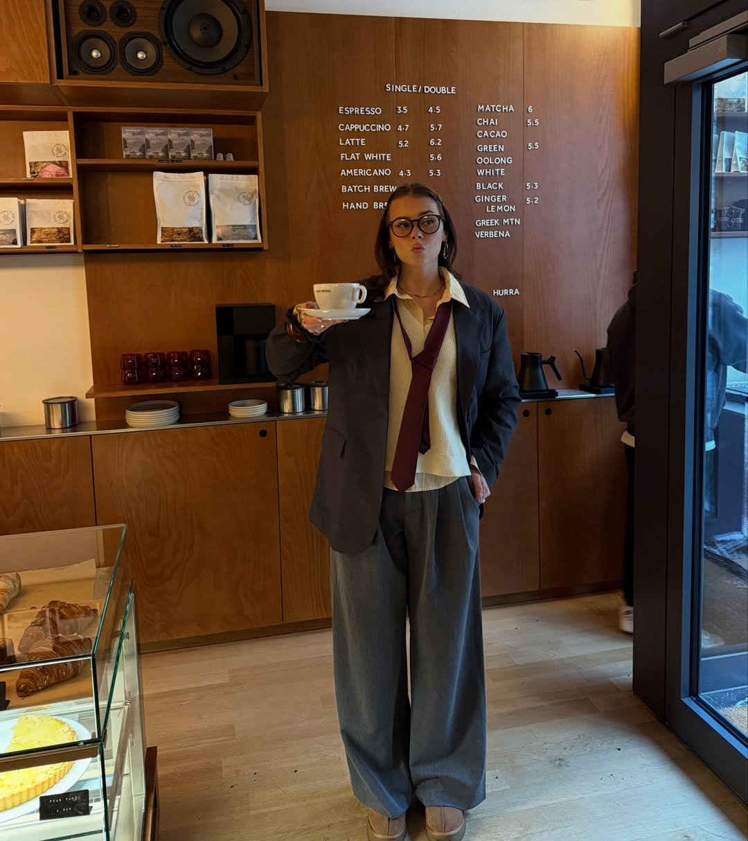 There’s something charming about a slightly undone, scholarly outfit at a café counter. A loose blazer layered over a soft sweater and wide-leg trousers creates that effortless “I stopped here between classes” aesthetic.