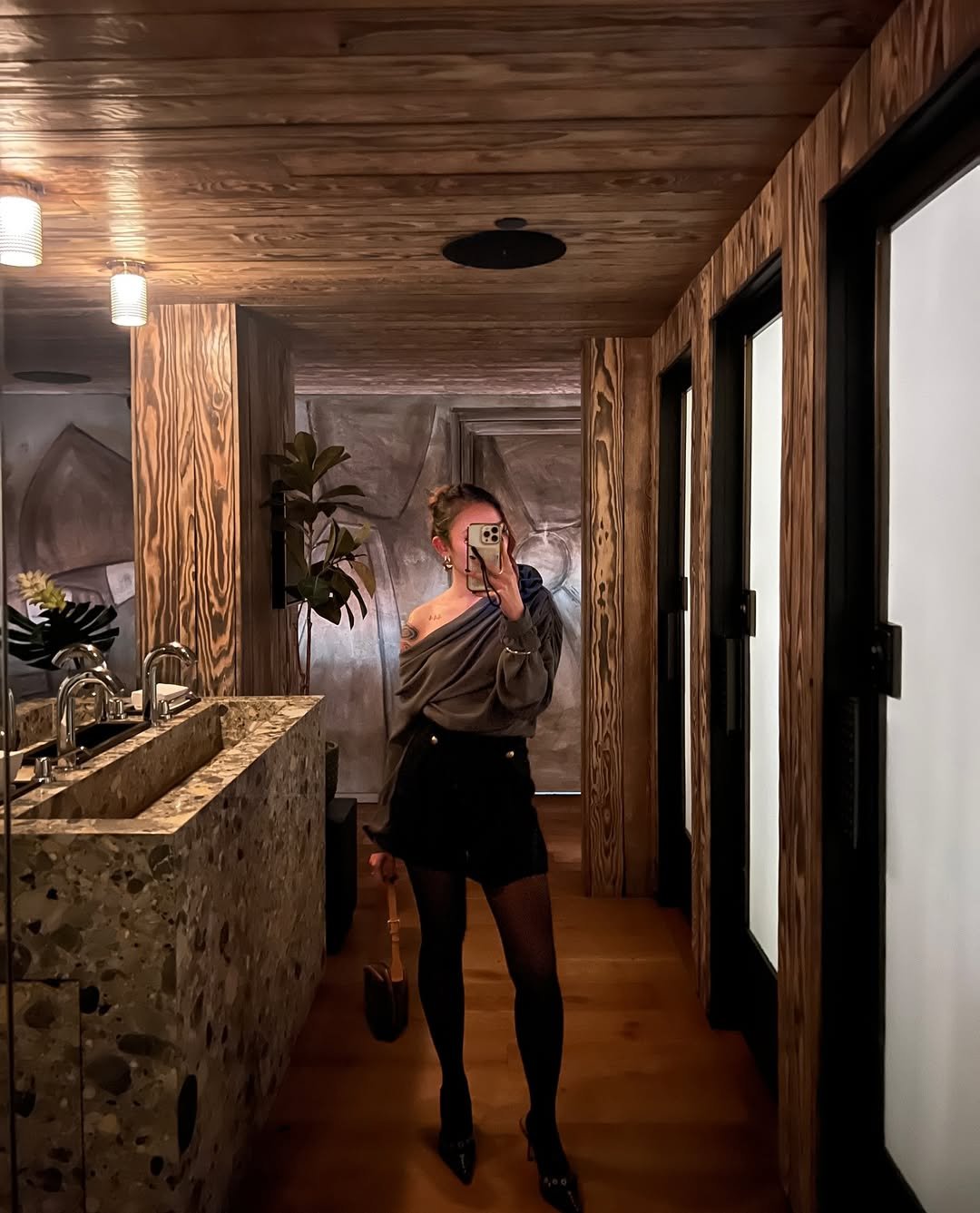 It’s minimal but striking. Add sheer tights and pointed heels, and suddenly a simple coffee stop turns into a stylish late-night espresso moment. The kind of outfit that feels a little dressed up but still relaxed enough for a spontaneous café run.