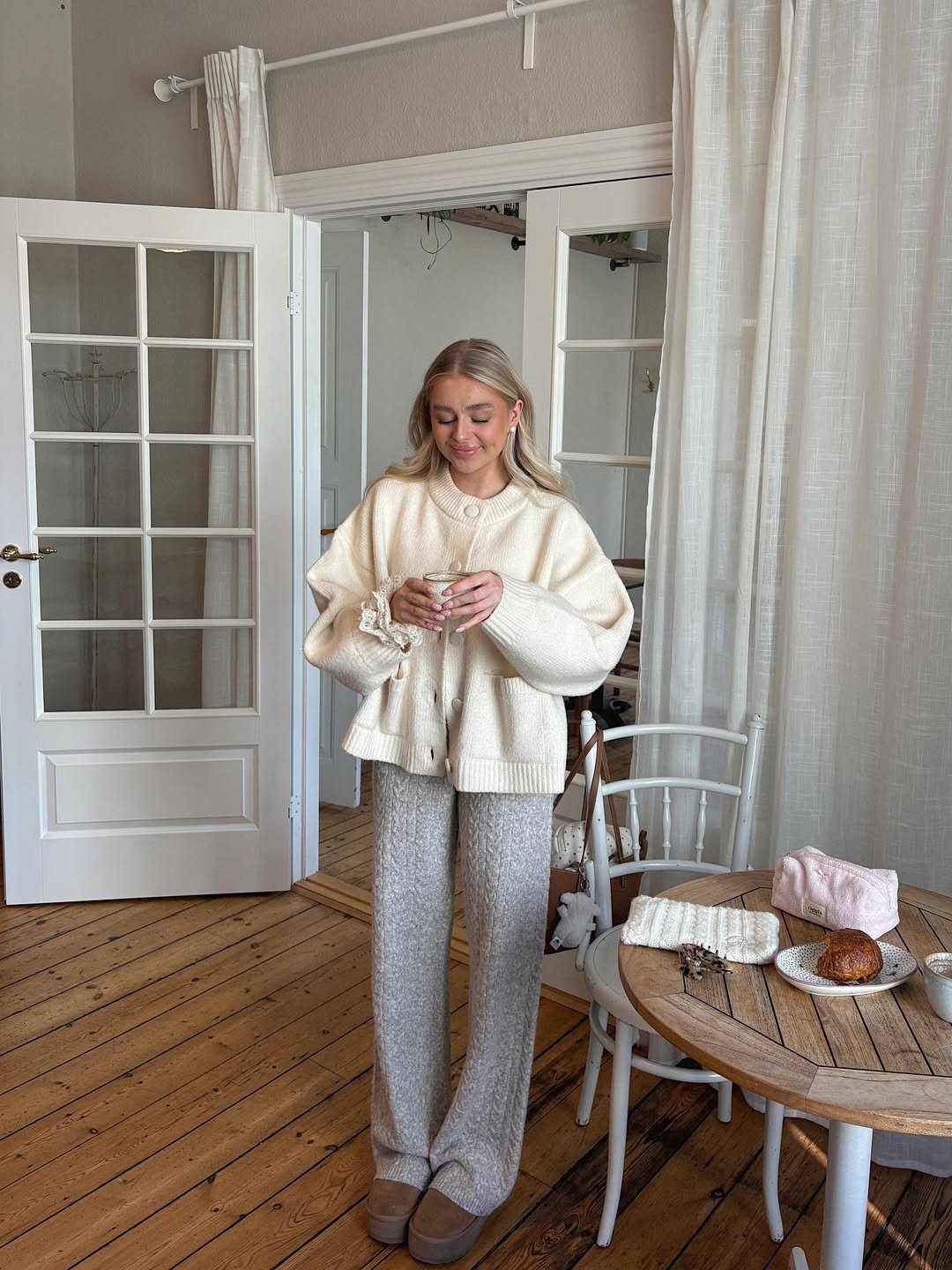 Some outfits feel like slow mornings and warm mugs, and this one captures that perfectly. The oversized cream cardigan paired with cozy knit trousers brings a relaxed silhouette that feels as comforting as the drink she’s holding.