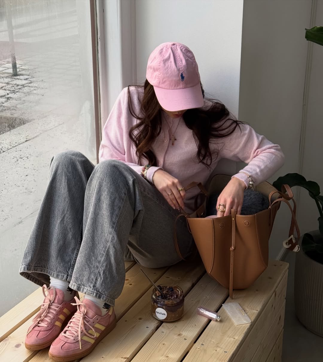 This outfit feels like a cozy window seat and a rainy afternoon latte. The soft pink sweater and matching cap create a sweet, monochrome palette that instantly feels warm and relaxed.