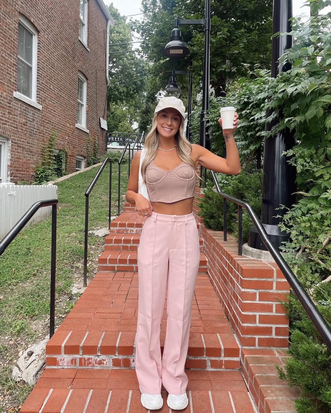 This look feels like sunshine and iced lattes. The blush-toned trousers paired with a fitted corset top create that clean, feminine silhouette that turns a simple coffee run into a full outfit moment. Add a neutral cap and sneakers, and suddenly the whole vibe becomes casual but styled.