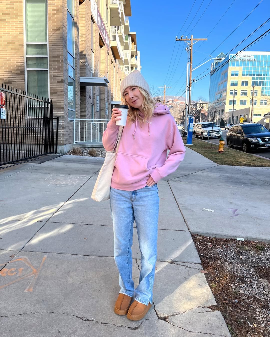 Some outfits are made for slow weekend mornings, and this one fits right in. A soft pink hoodie paired with relaxed denim and cozy slippers creates a look that feels easy, warm, and totally unbothered.
