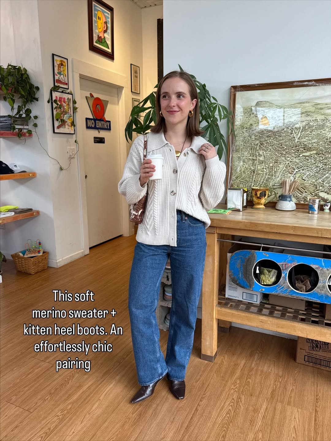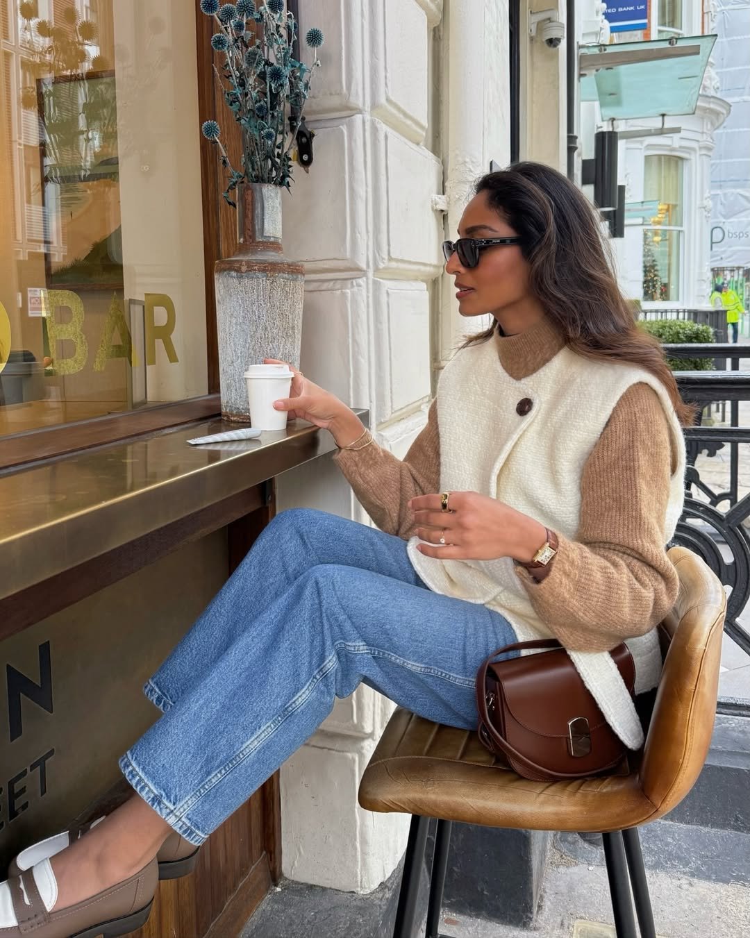 This mix of a creamy knit vest over a camel sweater feels rich in the most understated way. Paired with straight-leg jeans and neutral loafers, the look leans into warm, café tones that mirror the coffee itself.