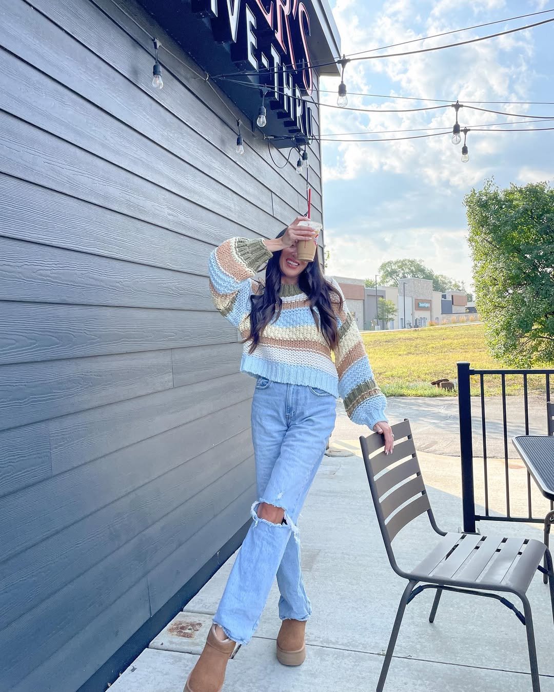This is the kind of coffee run look that feels like a Saturday morning in early fall. A chunky striped sweater in soft blues, creams, and muted olive tones paired with relaxed light-wash denim creates that effortless, just-threw-this-on charm. The distressed knees and platform boots add a little edge, while the oversized knit keeps it playful and warm.
