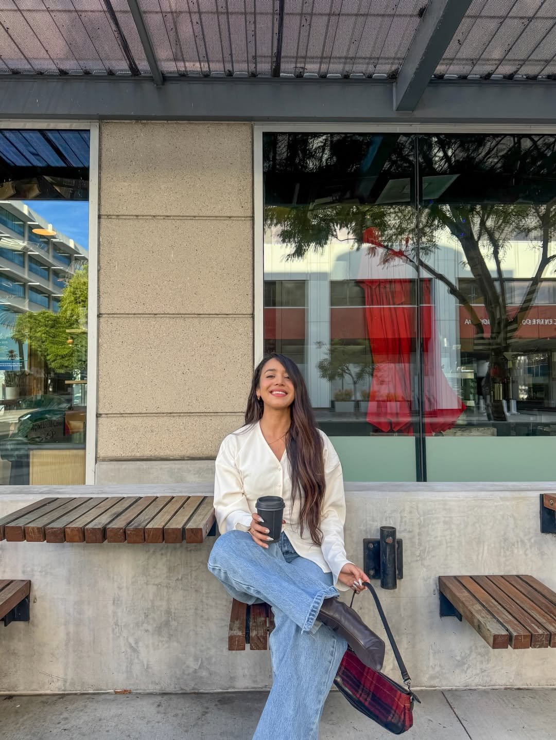 I love how it captures that carefree coffee shop energy. Hair down, latte in hand, sunlight hitting just right. It is casual but styled, which is exactly what a coffee run outfit should be. Comfortable enough to linger, cute enough to run into someone you know.