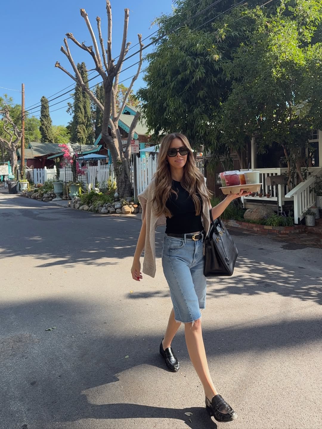 A black fitted tee and denim midi skirt might sound simple, but this combination feels polished in the best way. The gold-buckled belt defines the waist, and the draped neutral sweater over the shoulders adds that classic, country club touch. Finished with loafers and sleek sunglasses, it leans into quiet luxury without trying too hard.