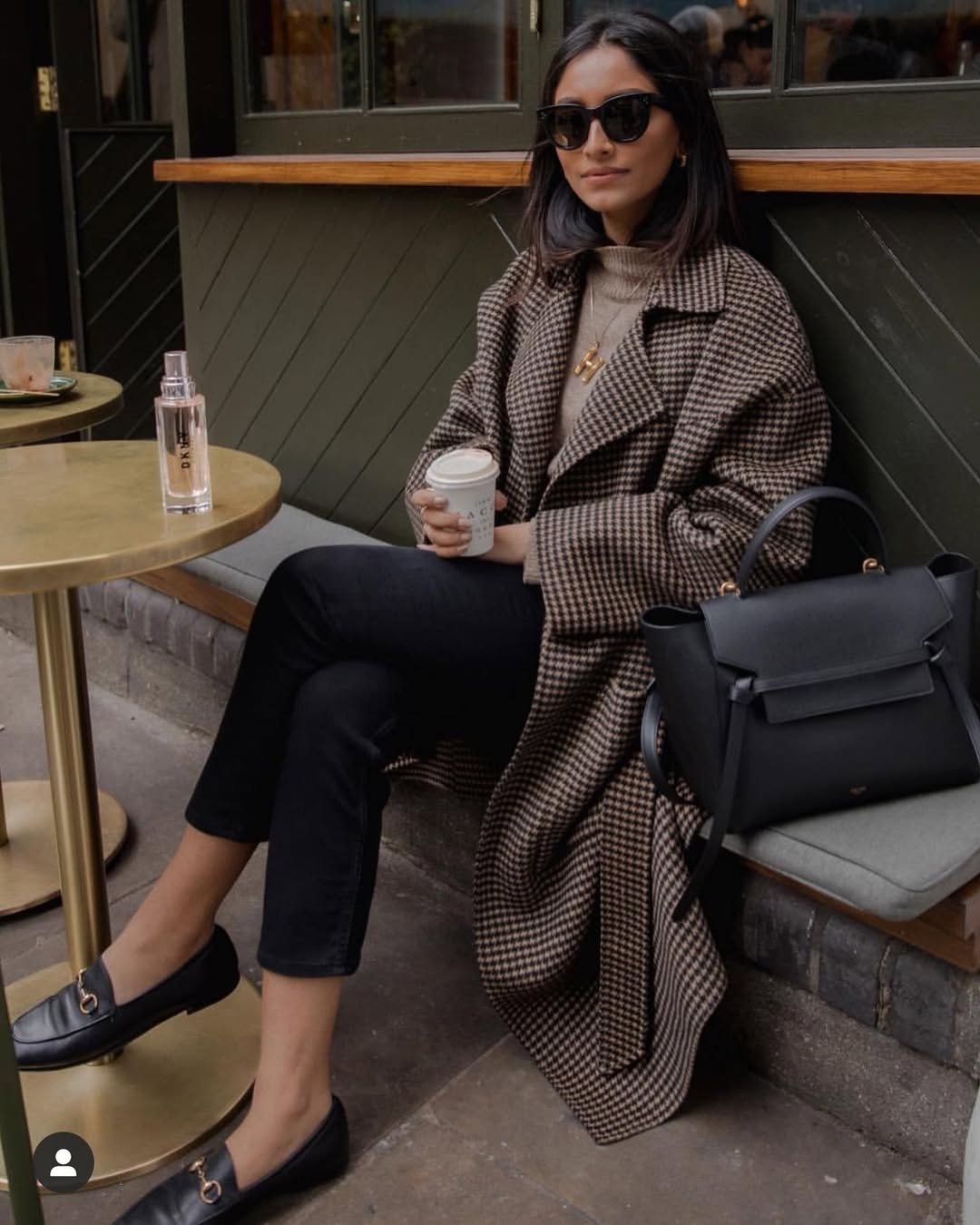 A long houndstooth coat over a taupe knit and black trousers gives major café-in-the-city energy. The structured black handbag and loafers keep it grounded, while the oversized sunglasses add a hint of mystery.
