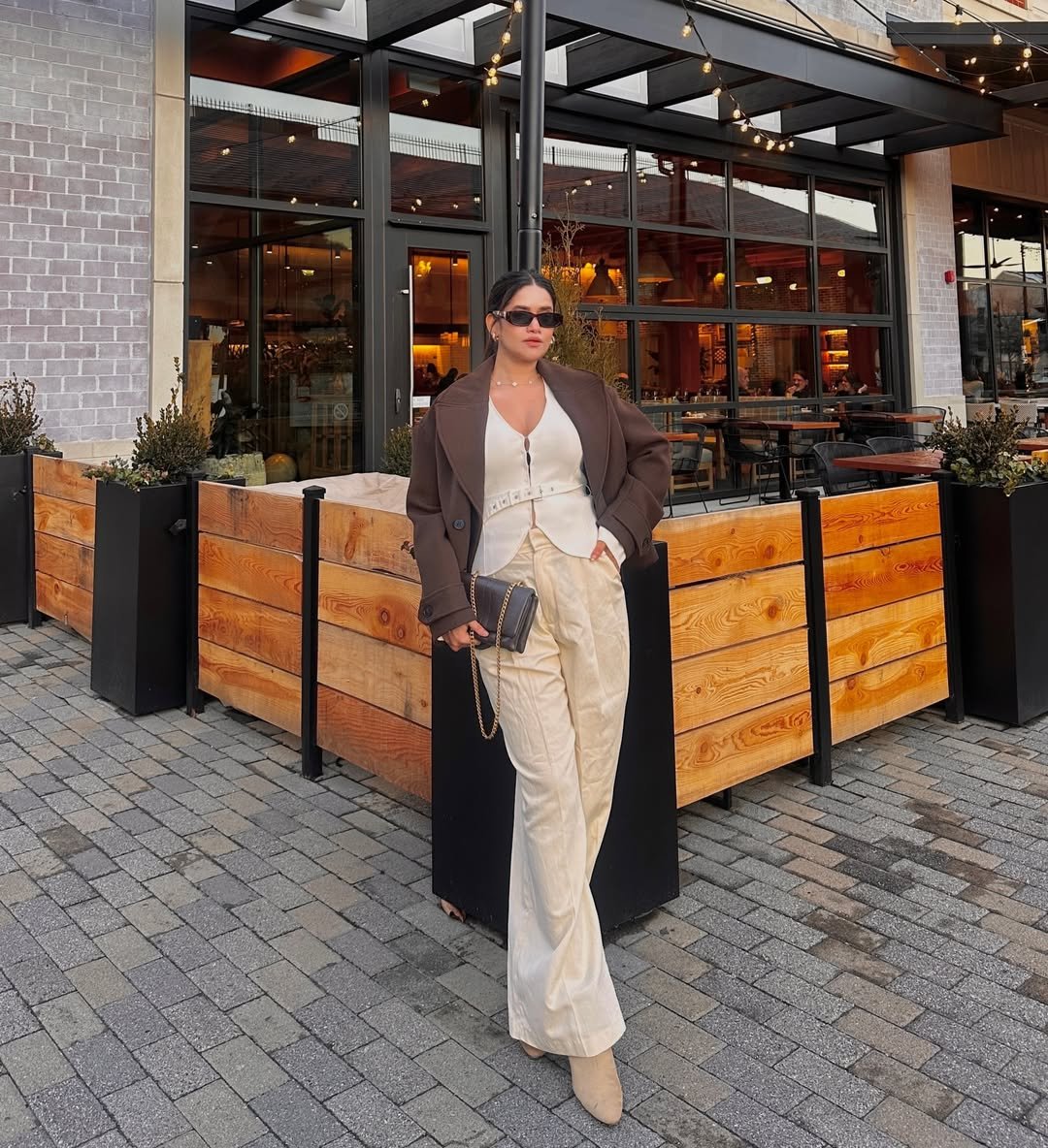 Head-to-toe cream and chocolate tones? Instant sophistication. The tailored vest layered under that structured blazer gives strong main-character energy, especially against that warm restaurant backdrop.
