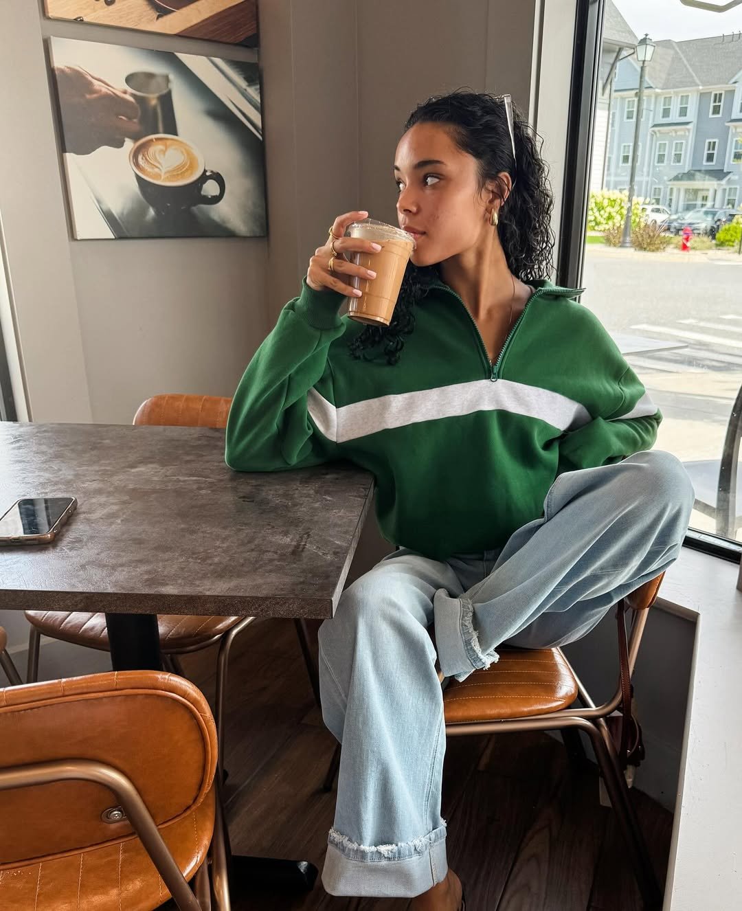 Green half-zip, relaxed denim, coffee in hand—this is off-duty done right. The oversized silhouette feels cozy, but the crisp white stripe keeps it sharp. It’s effortless without looking sleepy.