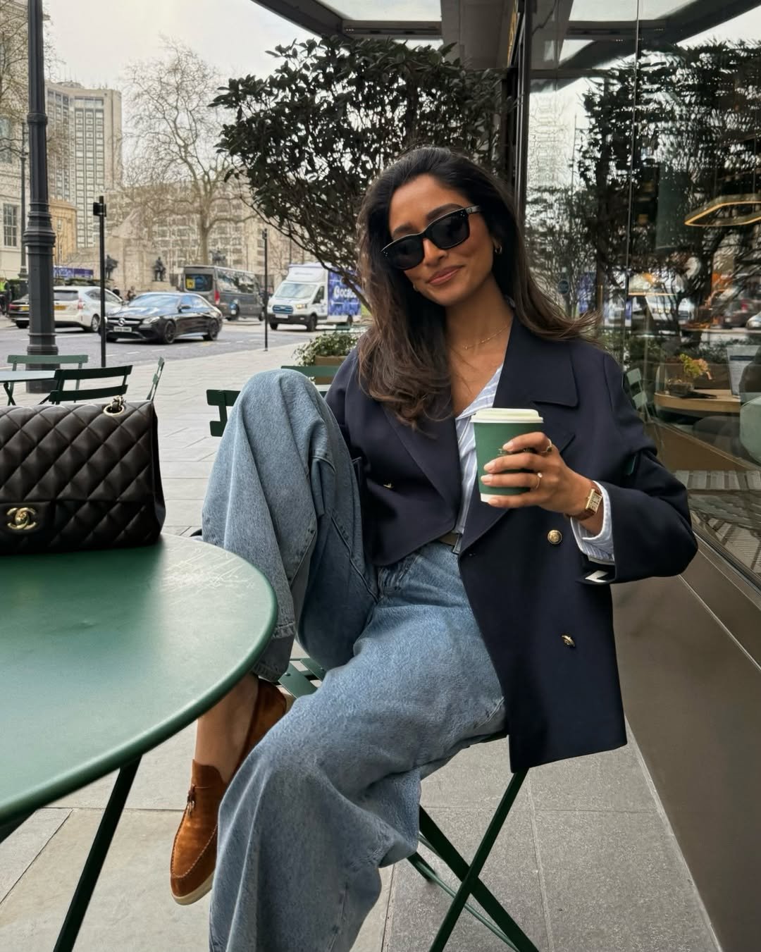 A navy blazer layered over a striped button-down with relaxed denim is always a win. The brown loafers and classic quilted bag bring in that old money energy, while the oversized sunglasses seal the deal. Sitting at a green café table with coffee in hand, it feels effortlessly European.