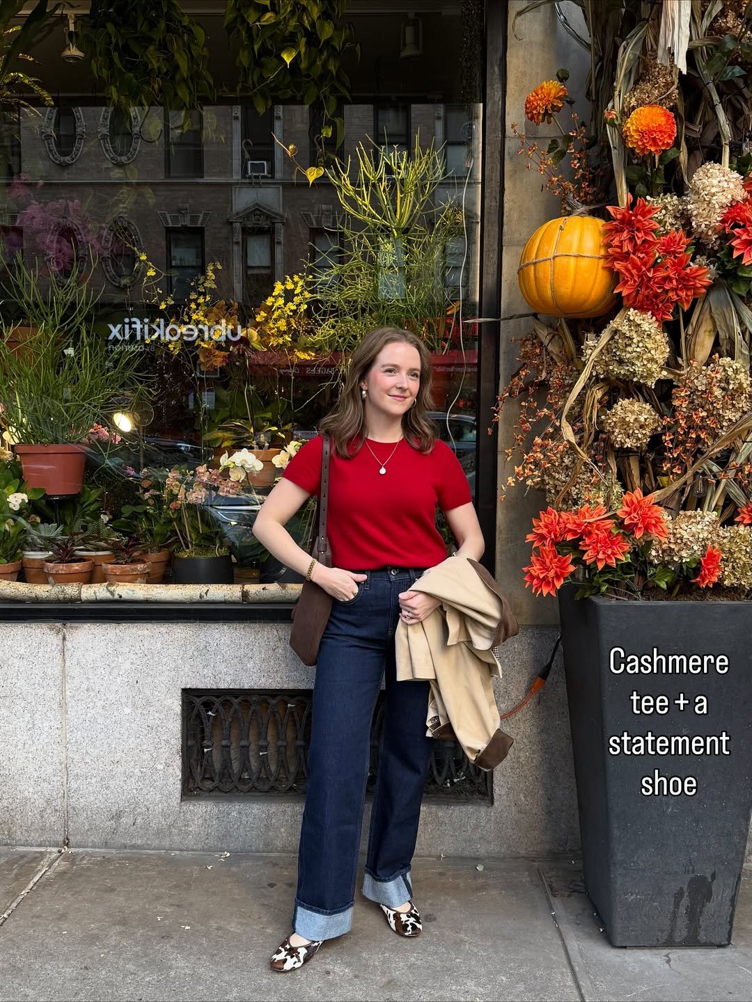 A red cashmere tee against that autumn floral backdrop? Absolute moment. The bold color adds instant energy, while the dark denim and statement flats ground the look perfectly.