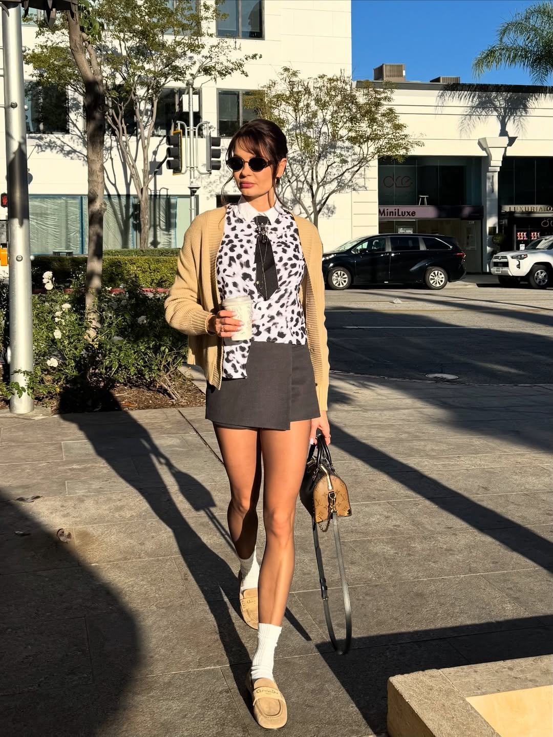 Printed blouse, skinny tie, mini skirt, cardigan—this is coffee run with personality. It’s giving retro prep but with a modern edge, especially with the loafers and socks combo.