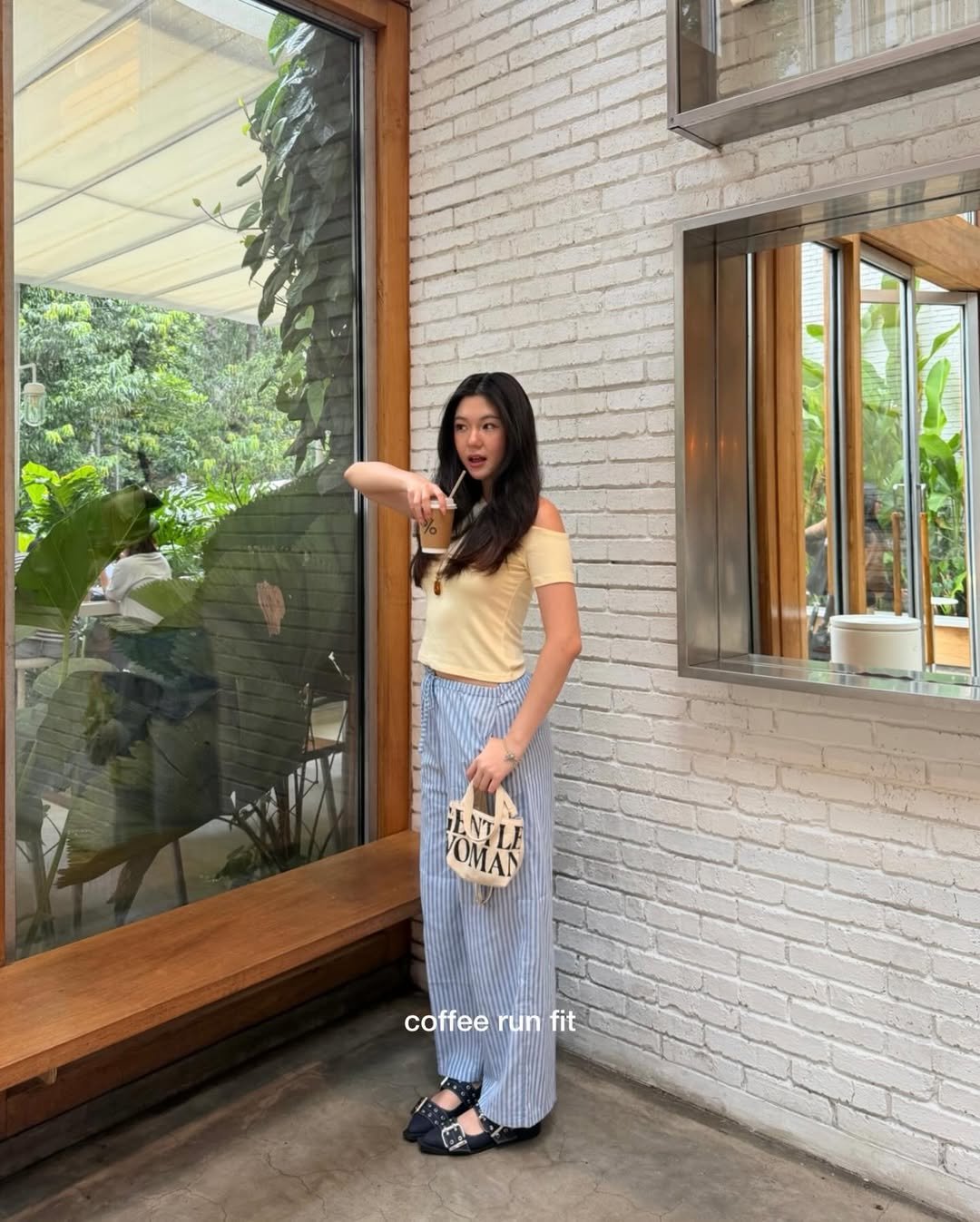 Off-shoulder tee with flowy striped pants is such a fresh combo. It’s relaxed but still flattering, especially with those statement flats and the cute tote.