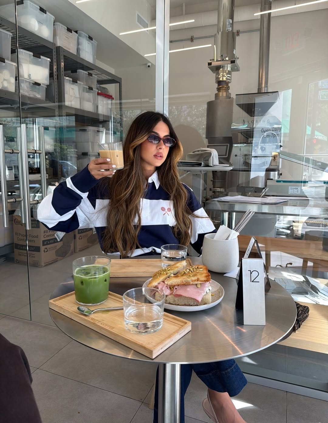 I love how the look balances prep and polish. Sandwich and matcha on the table, confidence in the posture. It’s that “I just stopped in for coffee” vibe… but you know the outfit was absolutely intentional.
