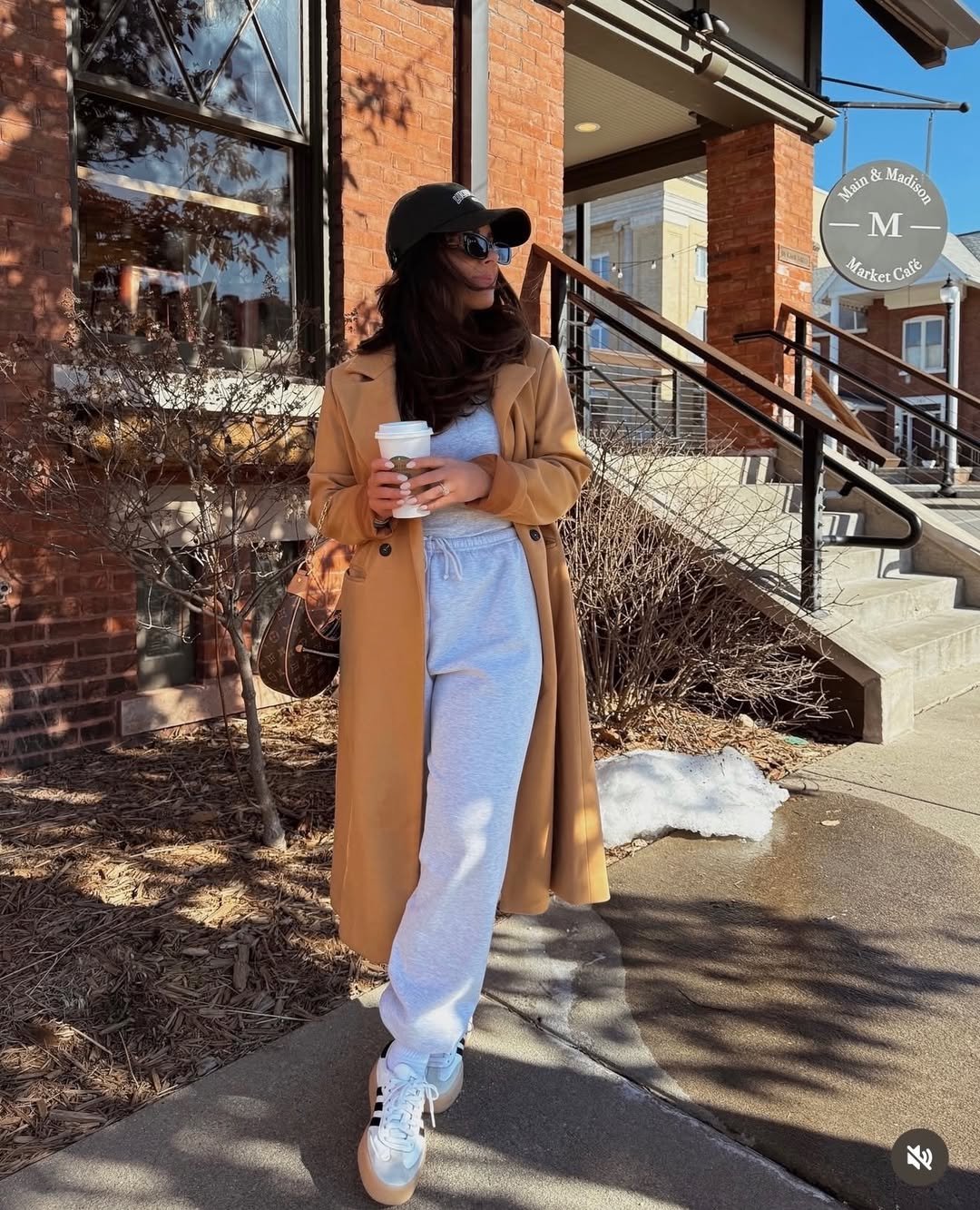 Long camel coat over a full grey sweatsuit? That’s how you upgrade athleisure in two seconds. Add a cap and crisp sneakers and suddenly it’s less “gym” and more “model off-duty.”