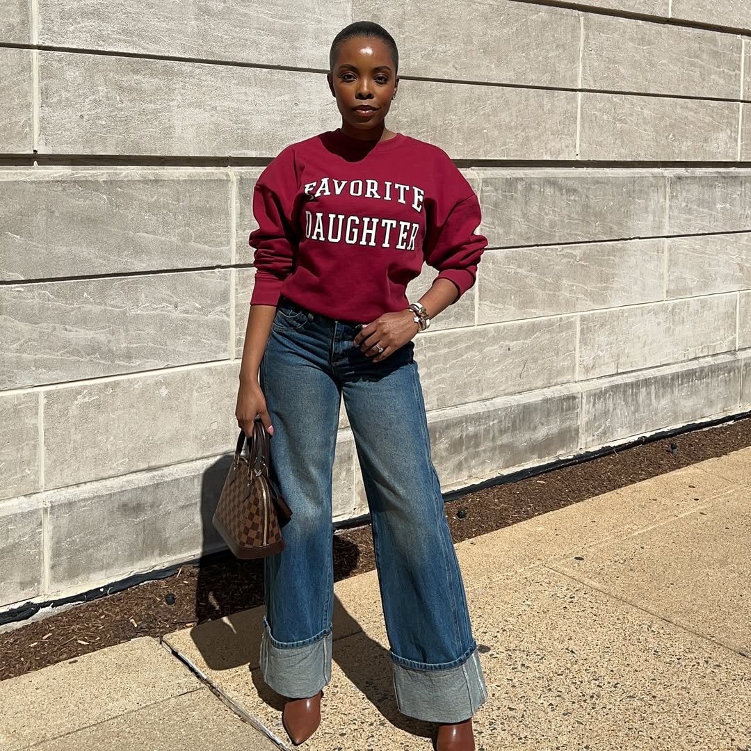 That bold red sweatshirt against classic wide-leg denim is such a power move. It’s relaxed, but it doesn’t blend in. And the structured bag plus pointed heels keep it sharp.