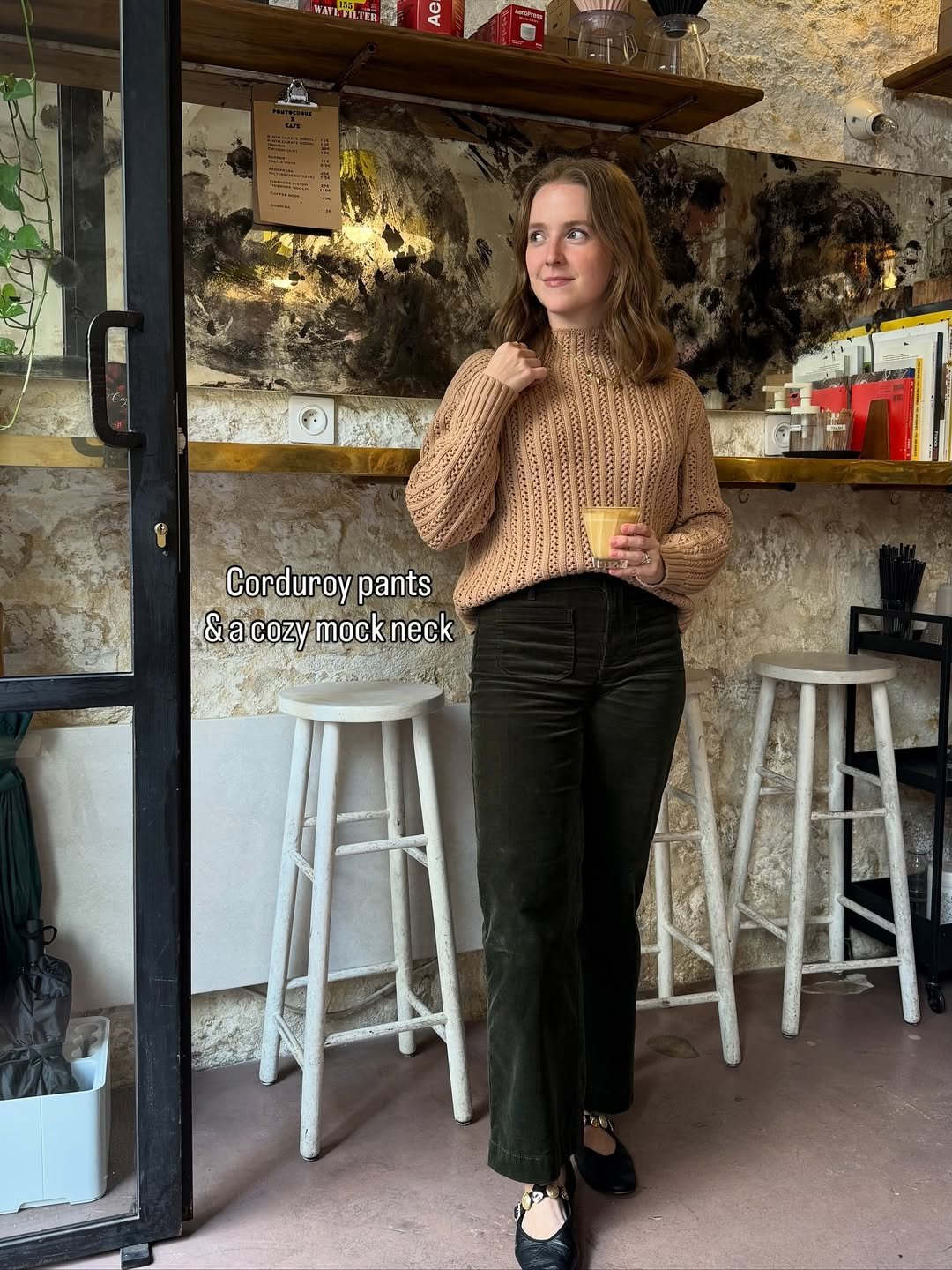 Corduroy pants and a mock neck knit? Fall layering at its finest. The rich brown tones play beautifully against the cozy café interior, creating a look that feels warm inside and out.